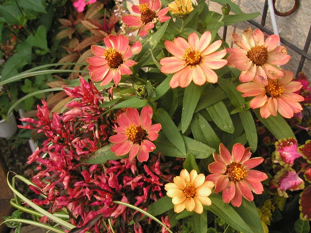 左中央のブルーの楚々とした花はロシアンセージです。とても気に入って宝塚から連れて帰りました。右はアイビーゼラニュウム、もうだめかと思ったのにここにきてもり返しました。 |