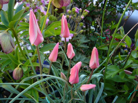 | 4/6 | 原種チューリップ、クルシアナ・レディージェーンです。 楚々とした姿がなんとも美しい。 ![]() 咲きすぎはまるで印象が変わるので、朝の咲きかけを撮りました。 こちらは夕方私としてはこの姿が好き。↑ 今日は良いお天気なのでウッドデッキのメンテナンスで色塗りを夫にしてもらいました。私は鉢類の整理です。芽がでなかったり、枯れたものもわんさか。鉢が増えすぎていけません。。思い切って鉢を捨てればいいのでしょうがねえ。。黒いビニールポットも・・・あっ、このポットのゴミ出しの分類は何だったっけ?この4月から神戸市は分類が細かく変更になったので「ワケトンBOOK」という虎の巻を見なくては!慣れてないからなんだか大変です。(^^;) 大事なデルフィニュームが骨折です。