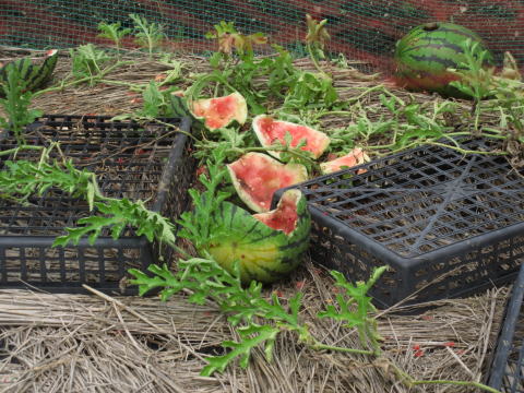 | 7/29 | 小動物?出現! 昨日畑に行ってみました。トウモロコシがとれそうというのでね。 ところが畑には食べ散らかした跡。1本も収穫できませんでした。 ![]() ![]() それどころか夫が力を入れて育てていたスイカが!! ガーン。 ![]() ![]() こんな食べ方をするのですよ、もっぱらアライグマだとのうわさ。だれも見たことはないのですが、畑のお隣さんもそのお隣さんもトウモロコシやウリを食べられて一様にヤラレタとがっかりしていました。もうやる気がなくなったと。(>_<) とても1匹では食べきれないでしょう。夜中に座り込んで宴会?をしたのかもしれない。(笑)なんか姿を想像できるようです。 これまで大2個、小玉1個収穫していました。あとはもう少し様子を見ようと残していたのです。 小玉スイカは甘かったのか赤い部分は少しものこしていませんでした。(下半分) ![]() ![]() ただね1個だけ大きなスイカ、葉っぱの陰になっていた分↓は無傷で残っていました。 これはヤツにも見つけられなかったか。無事。それだけを抱えて持ち帰り、今日切ってみましたよ。これは甘くておいしい! 四等分にしてご近所さんにもおすそ分けしました。 9,7kg。4分の1でもかなり大きくて冷蔵庫を占領しています。 下を太めのネットで囲い、その上から天井部分に細いネットを張っています。上は鳥を防ぐため。盲点は中ほどの継ぎ目にあった。全部を閉じていなかったのですね。そこから入ったとしか考えられません。 |