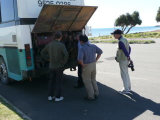さてここでさあ出発というときになって、バスのエンジンがかからなくなってしまった。運転手のマイクさん、機械室をあけたり、携帯でどこかに電話したり・・・町といっても修理工場があるようなところではない。マイクさんとガイドさんは近所の民家を訪ねて自動車に詳しい人がいないか聞いたようだ。