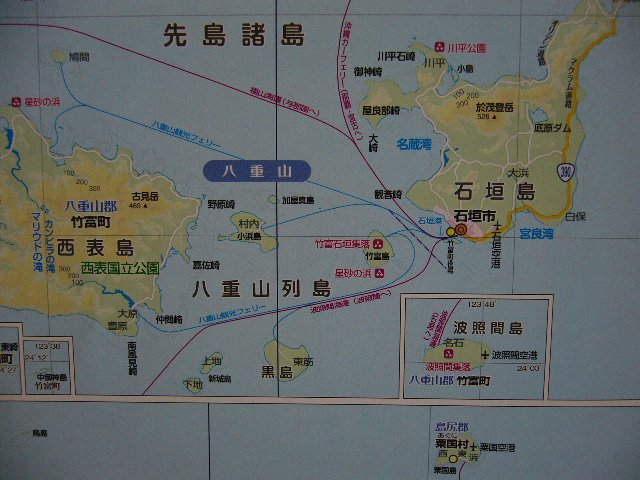 ここですね。右、石垣市と沖の島が3つ。中央右が竹富島、左が黒島、中央向こうが小浜島。