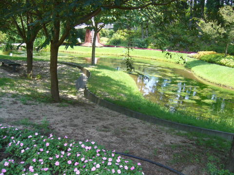 花の谷 水辺があって、オランダ・キューケンホフコーナー(交流の証として)。風車があったりしますが、今の時期、コリウスの葉の色を楽しむ事ができます。オランダ風の花壇というのはよくわからなかったけれど、春にはチューリップがいっぱい咲くのかな?汽車ぽっぽはフラワートレインで、20分で園内の見所を1周します。大人も乗れま〜す♪
